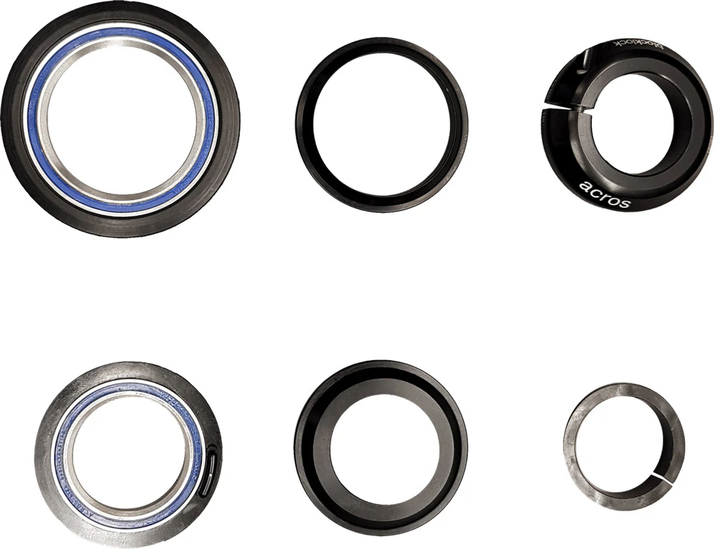 Le jeu de direction semi-intégré #17 de Cube (ZS44/28.6 – ZS56/40) avec protection de la butée de direction Block-Lock pour pivot de fourche conique 1 1/2″. De plus, il y a un cône de réduction pour un pivot de fourche de 1 1/8″.